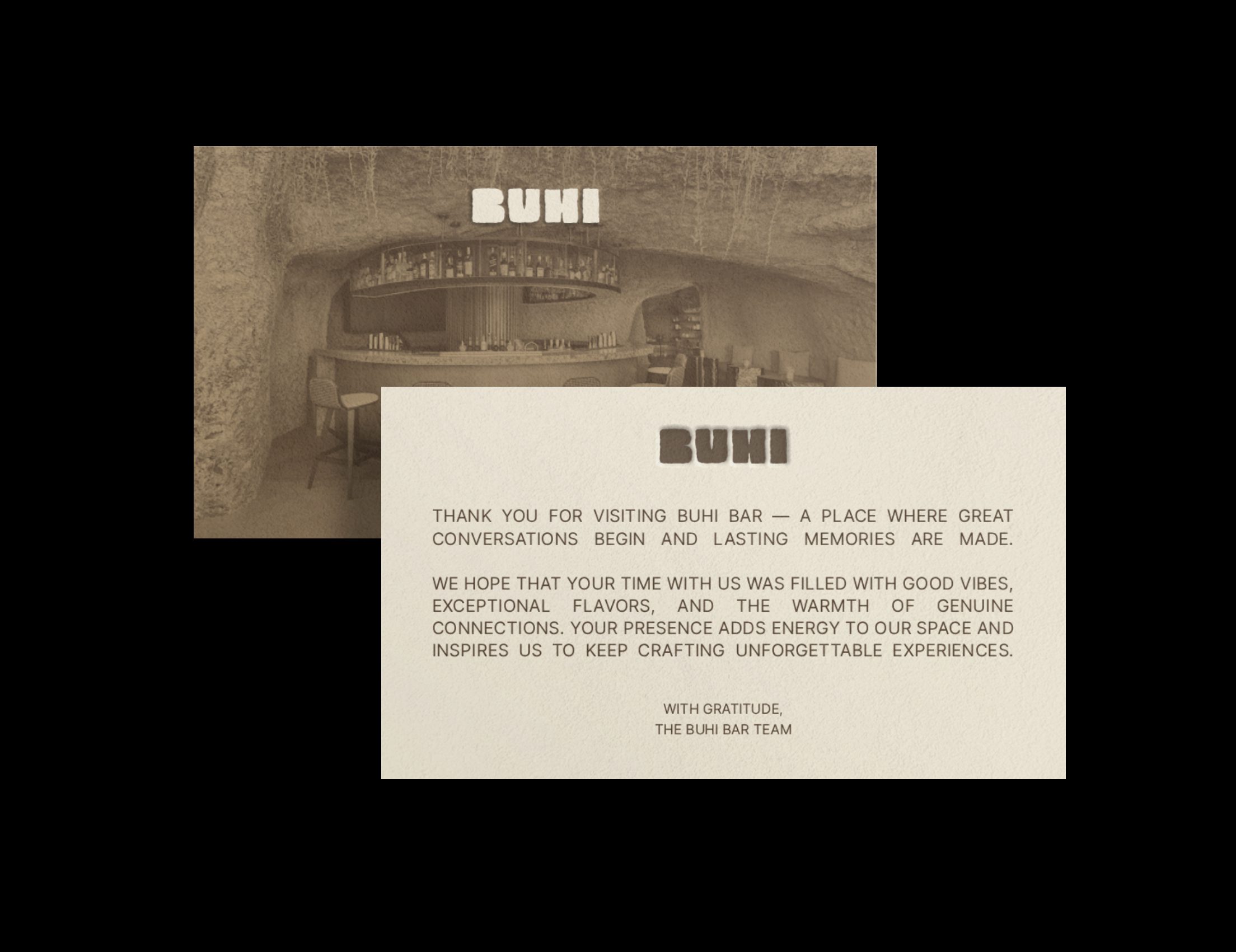 Buhi Bar needed a brand identity that captured its unique setting as a cozy bar nestled inside a cave, without falling into clichés or losing its modern appeal. The challenge was to translate this organic, hidden-away atmosphere into a visual identity that felt fresh, inviting, and aligned with the laid-back spirit of the space. It had to reflect the raw textures of nature while remaining adaptable for menus, merchandise, and digital use.
