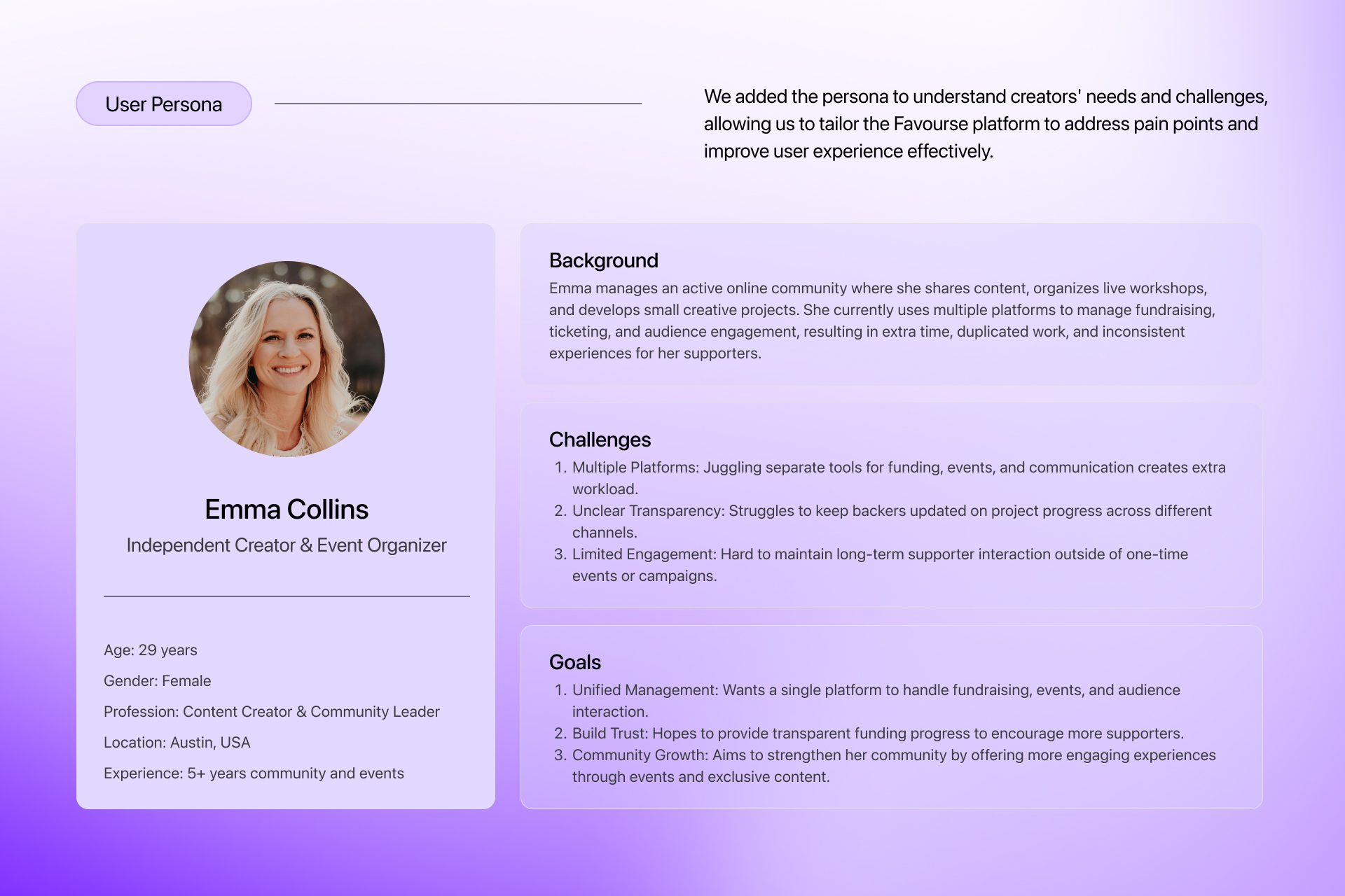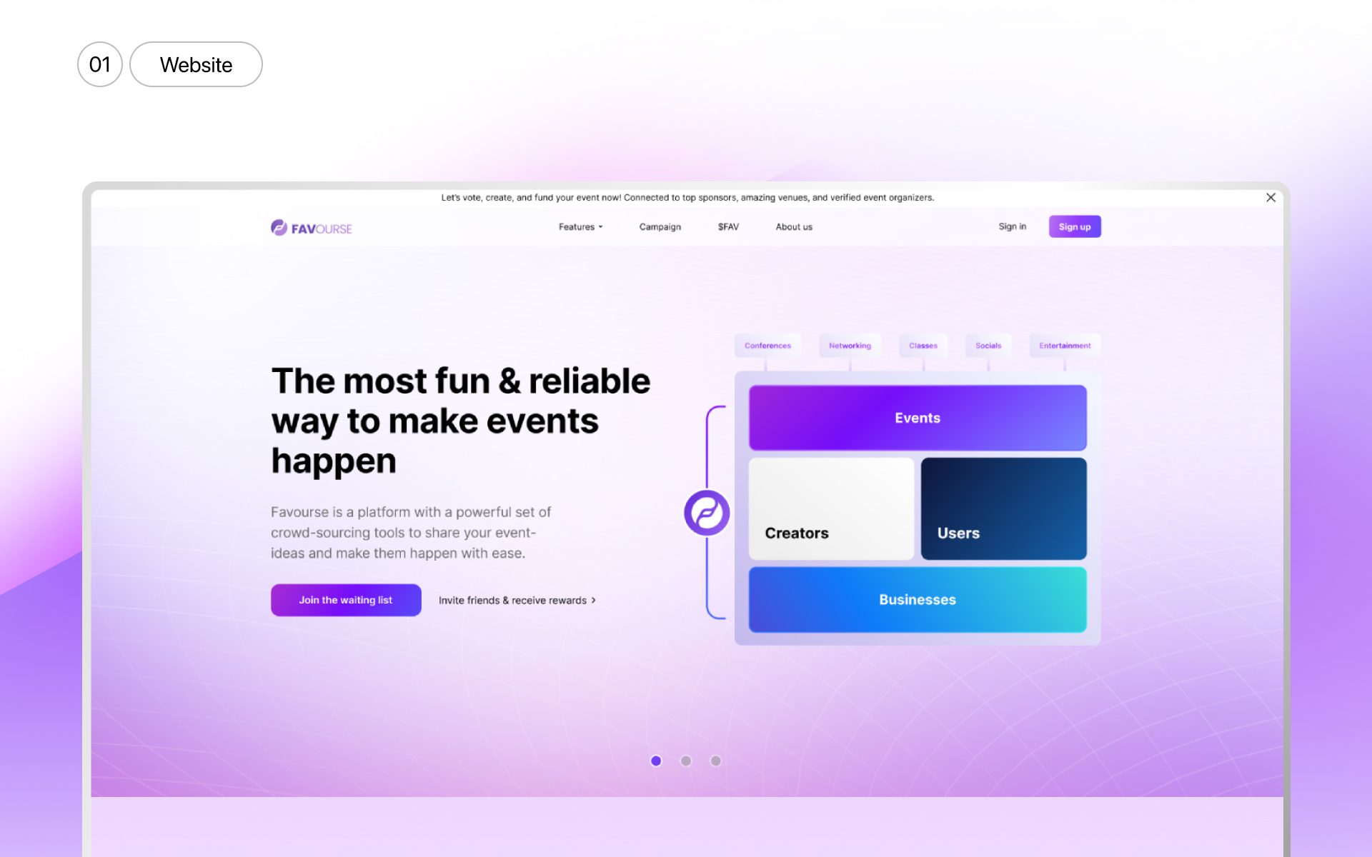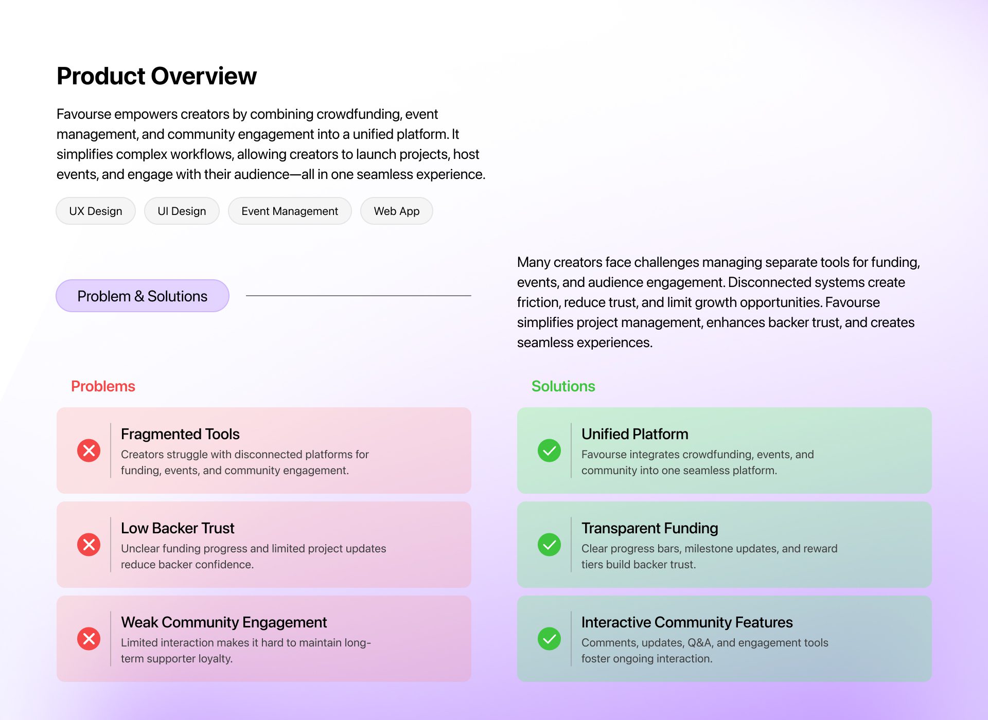 The crowdfunding space is competitive, with many platforms leaning heavily toward either corporate professionalism or overly casual aesthetics. Favourse needed to stand out as approachable yet credible, appealing to both grassroots creators and professional project leads. The challenge was to create a brand system that could flex across campaign pages, event promotions, and community engagement materials while remaining instantly recognizable.