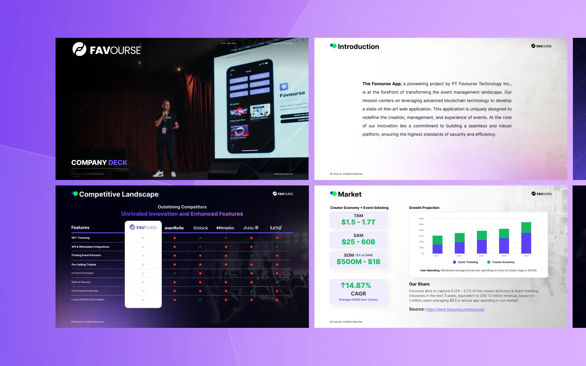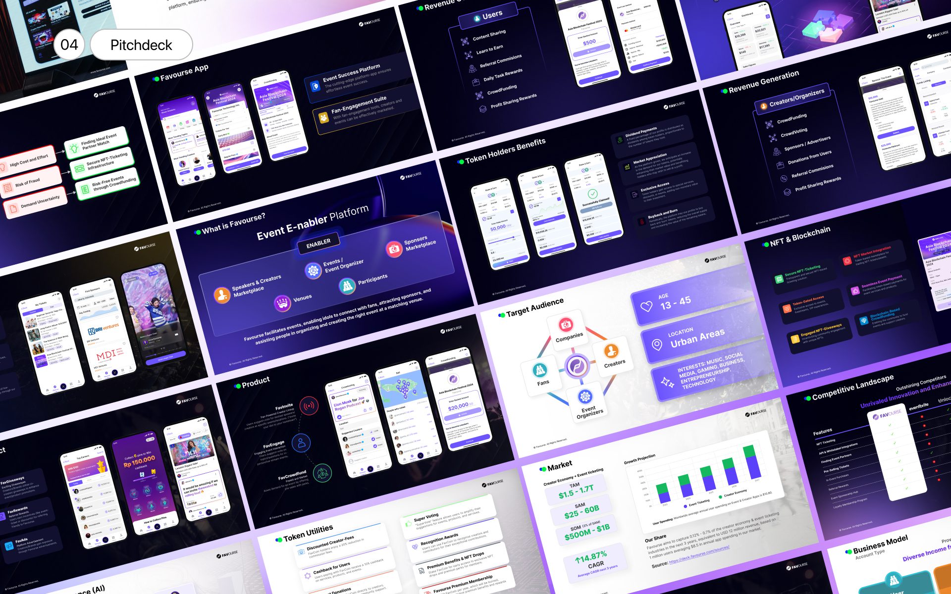 The pitch deck was designed for investors and partners, using a clean layout with strong visual storytelling. Data visualization, milestone highlights, and product previews were integrated to present Favourse’s vision clearly and persuasively.