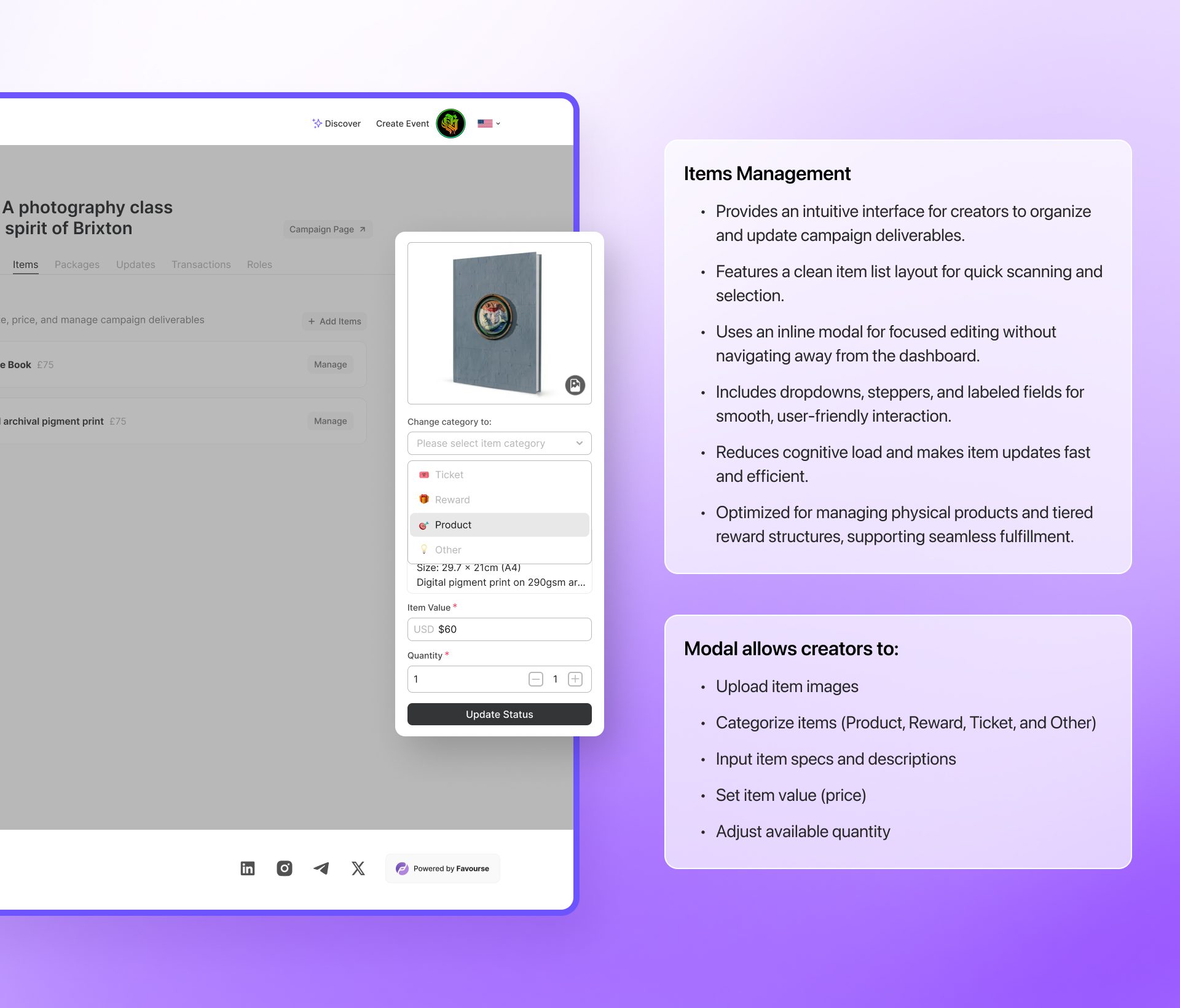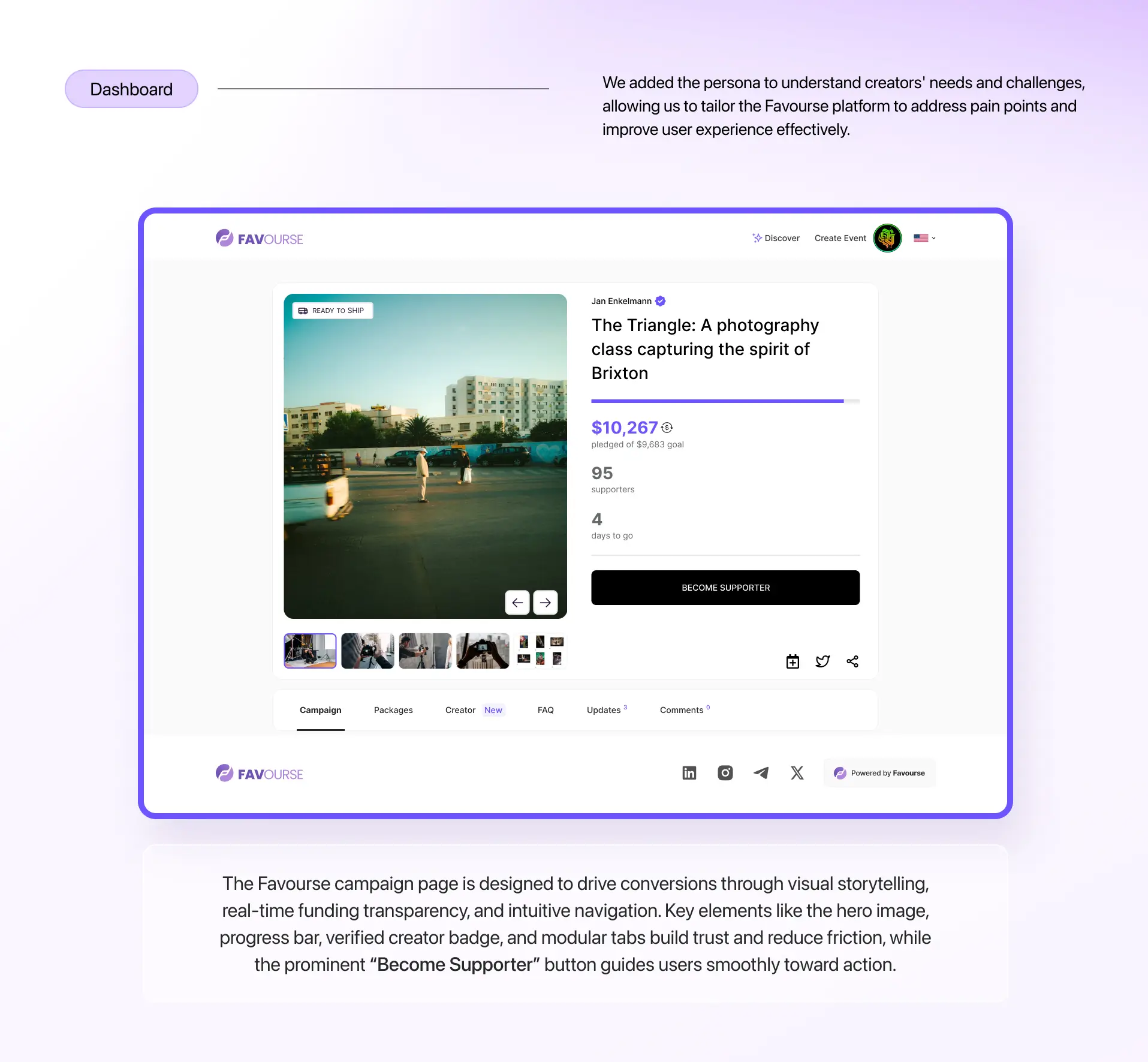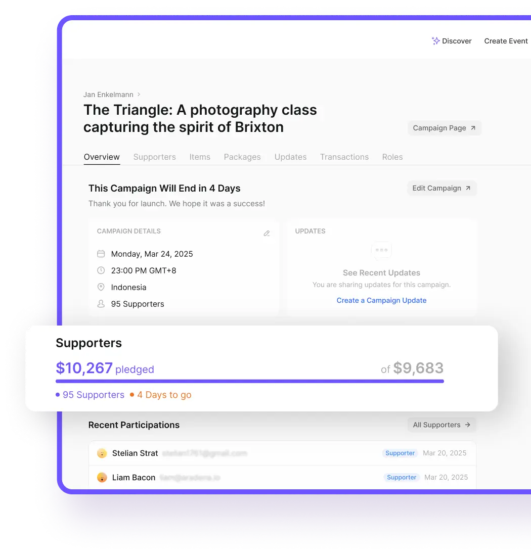 • A smart modular layout provides creators with full control over campaign status, transactions, and updates.