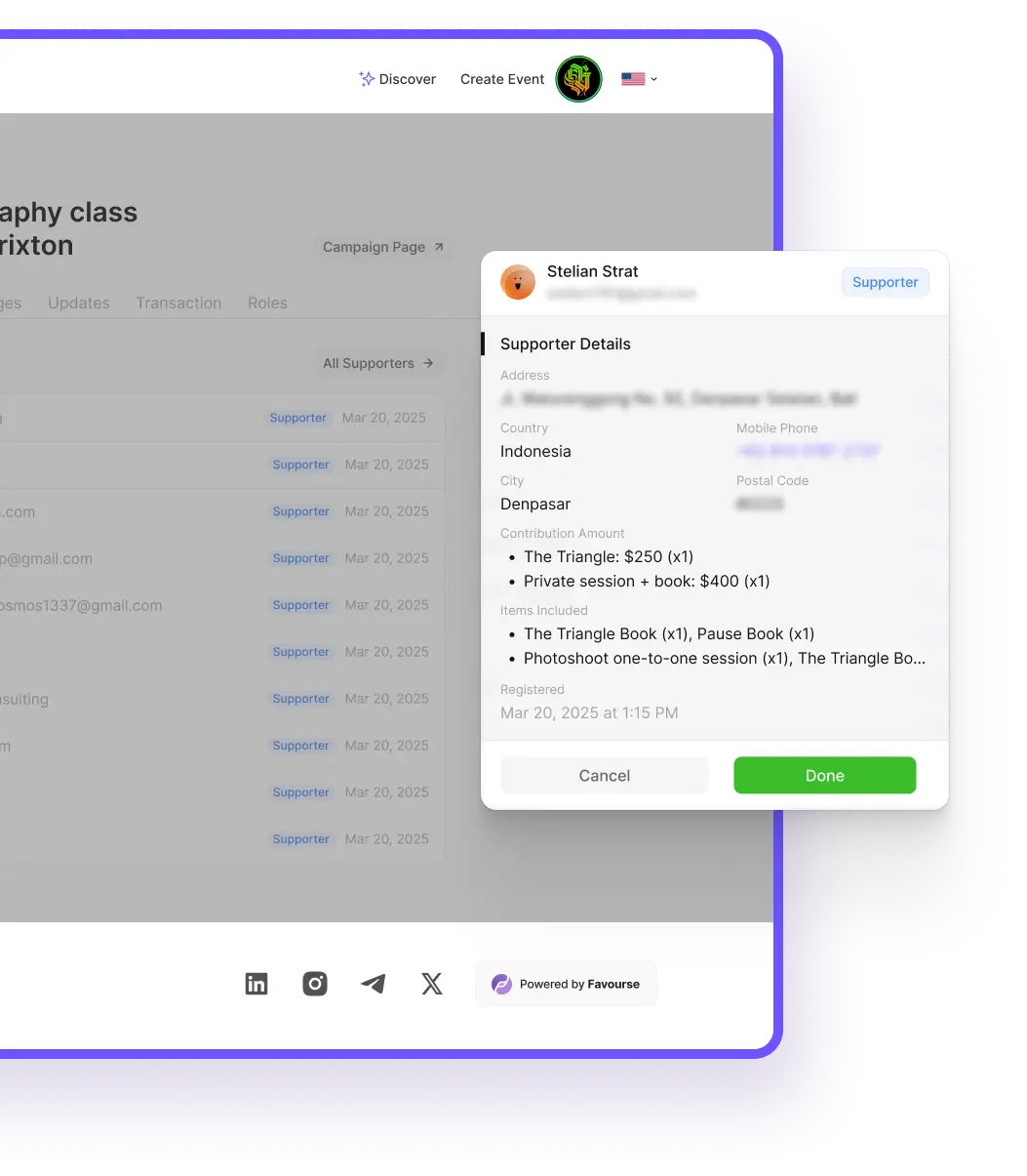 Favourse is a platform that empowers creators, entrepreneurs, and communities to bring their projects to life through crowdfunding and event-based engagement. By combining funding tools with audience-building features, Favourse helps ideas move from concept to reality while fostering strong supporter relationships.