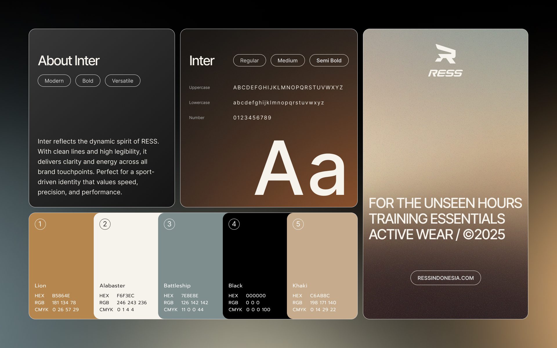 I chose colors that blend energy and warmth. Lion and Khaki form the core of the brand palette. They feel strong and grounded. Alabaster and Battleship serve as neutral backgrounds, improving clarity in design. Black anchors the palette. It adds bold contrast and a sense of authority.